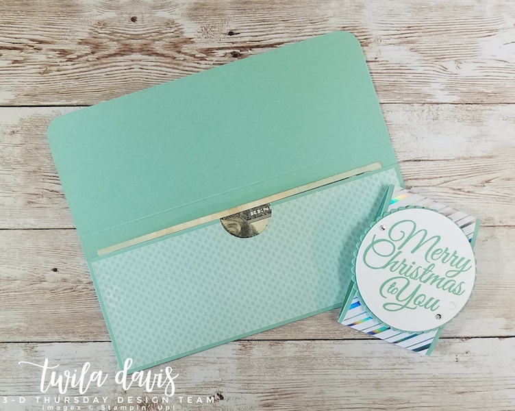 The stamp set I used is also from the Holiday Book named Holly Jolly Wishes (156362). Paired with Mint Macaron ink and cardstock makes for a beautiful money holder.